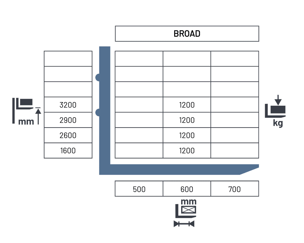 Notre gerbeur électrique à fourches réglables BROAD a des fourches et un tablier de fourche variables. Le bon choix pour une manutention flexible de différentes tailles de palettes dans un espace restreint. Par exemple, les palettes Euro (EPAL 1) et les conteneurs grillagés peuvent être pris en charge non seulement dans le sens de la longueur, mais aussi dans le sens de la largeur.